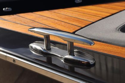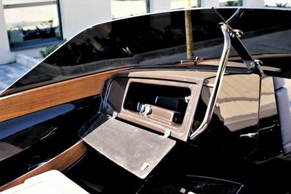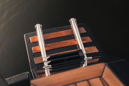 Der einzigartige Charakter des Bootes wird durch die Verwendung von hochwertigen Materialien wie Kohlefaser und hochglanzpoliertem Edelstahl unterstrichen. Der warme Ton des Teakholzes harmoniert wunderbar mit den sorgfältig ausgewählten Farbtönen der Gelcoats Espresso Black und Cup White.